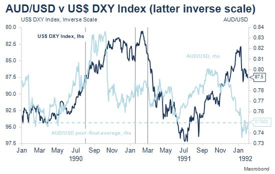 The US$ was weakening sharply as the Gulf War began, which along with the resultant higher energy prices and favourable interest rate differentials with the US, saw the $A continue to rise. A sharp fall occurred in October 1990 as it became apparent the $A’s valuation was not justified based on rapidly deteriorating economic fundamentals.