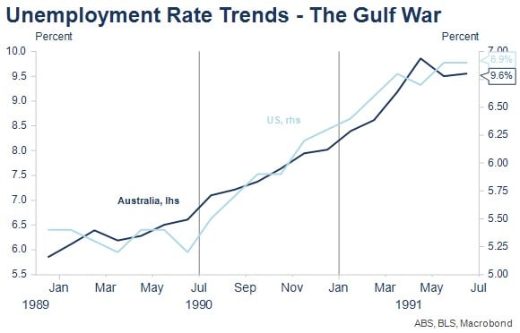 The broader economic context was important in terms of the reaction of both policy interest rates, equities and currency developments. Both the US and Australia were entering recession, not caused by the Gulf War, but exacerbated by the higher oil prices and bond yields that resulted for a time. Importantly, while war uncertainties may have delayed easing moves in the US a little, in the end, both central banks reacted to the domestic economic fundamentals they faced and continued to reduce interest rates as unemployment rose in both countries.