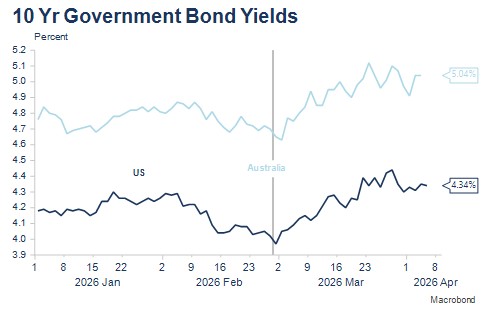 Friday 10 April – (Overnight) US CPI March. A 0.3% m/m and 2.7% y/y ex food and energy reading is expected. There will also be considerable interest in the extent to which the University of Michigan’s long-term (5-10 year) inflationary expectations series moves. Markets are expecting a lift from 3.2% to 3.5%. The Fed (and other central banks) will be sensitive to any rise in longer-term inflationary expectations.