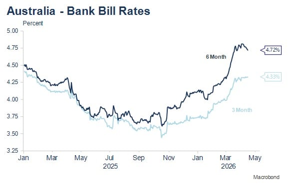 Short-term interest rates and longer-term bond yields were relatively quiet over the week, before dropping sharply on Friday on news of the reopening of the Strait of Hormuz. Some rebound is likely early on Monday given weekend developments. US markets continue to price some mild risk of a further US rate cut, though a full rate reduction is not priced until July 2027. Meanwhile, Australian shorter-term yields further discounted a third successive interest rate rise by the RBA, this now being 77% priced for May and 99% priced by June. I continue to think a June move is more likely.